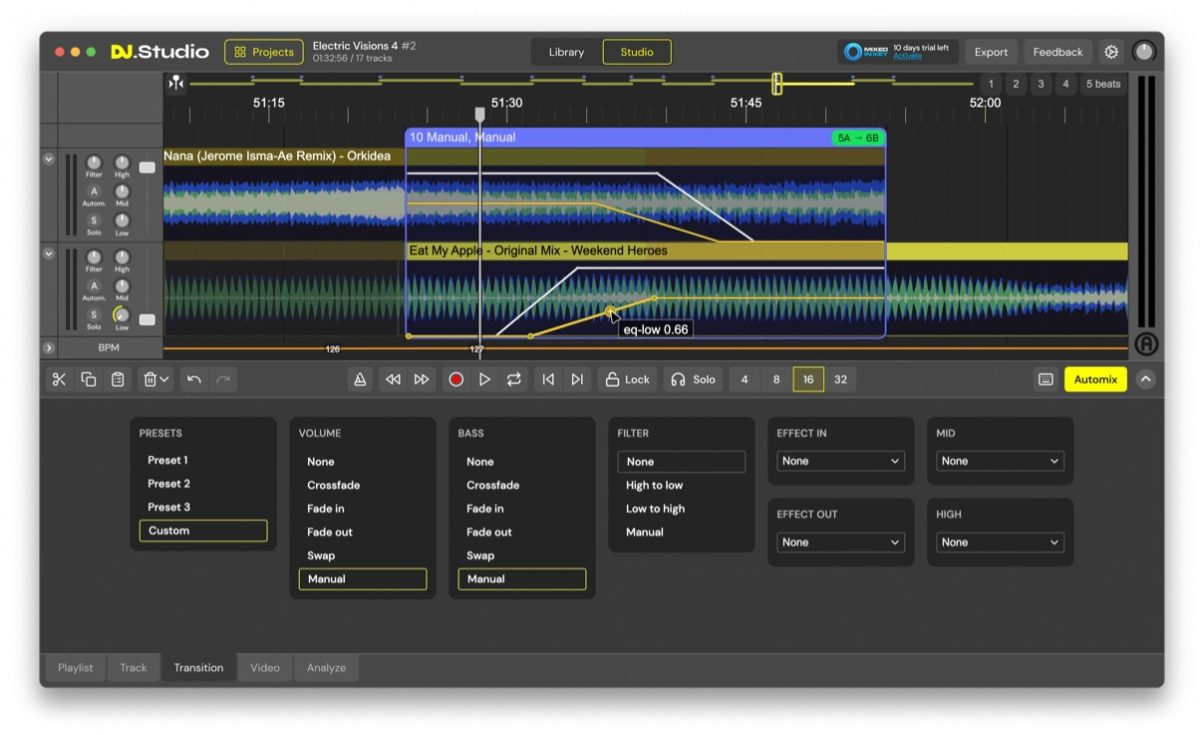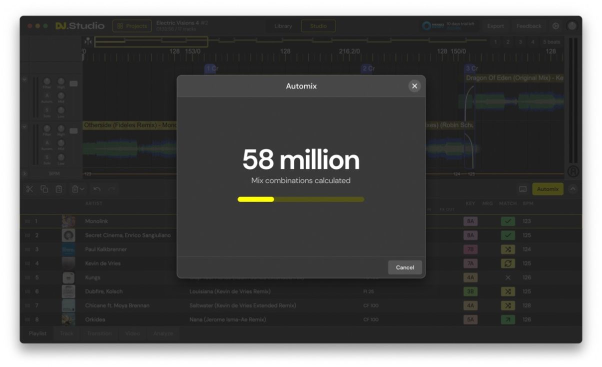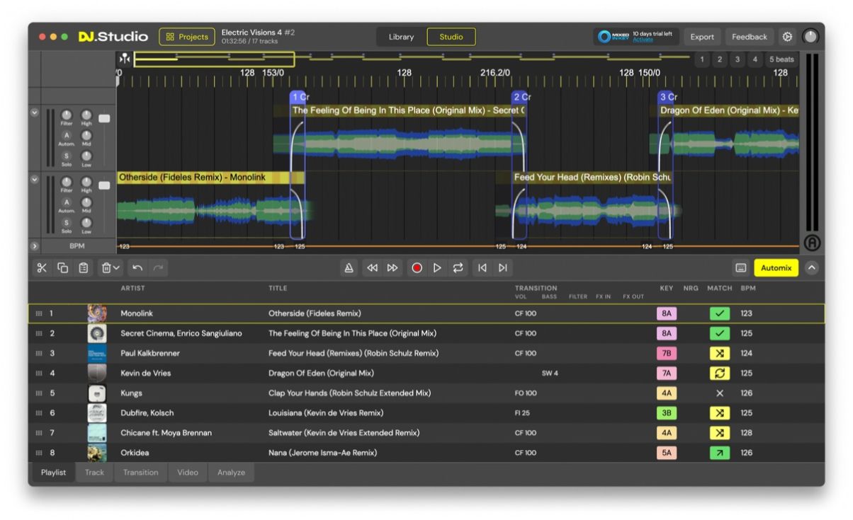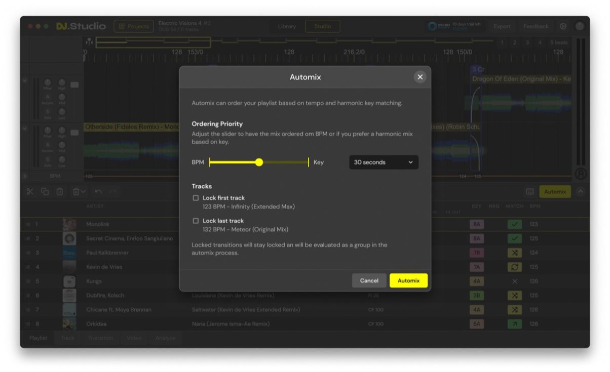 But where DJ.Studio is different is that it can automate this for you, as much or little as you’d like. Give it a bunch of tracks and it will not only calculate a good order for them (you can tell it to respect your choice of first and last track in the mix if you like), but it will make sure everything matches, including key, BPM, and musical phrasing.
