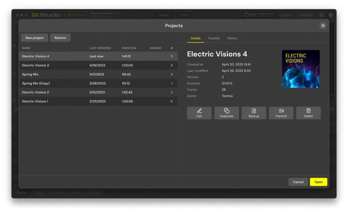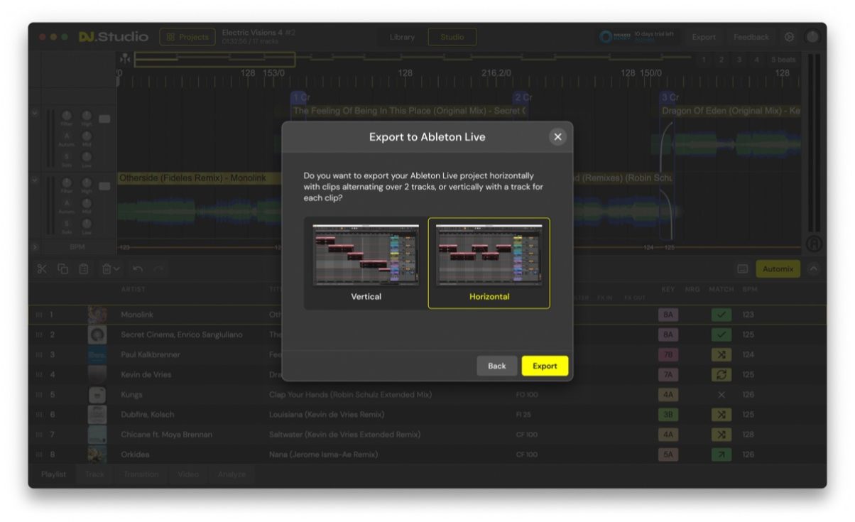 - Exporting to Ableton Live – It can export the whole mix as an Ableton Live project, with vertical or horizontal (two track) options. This is amazing for radio DJs who may want to build a mix in DJ.Studio and finish off in Ableton. All effect automations etc carry over