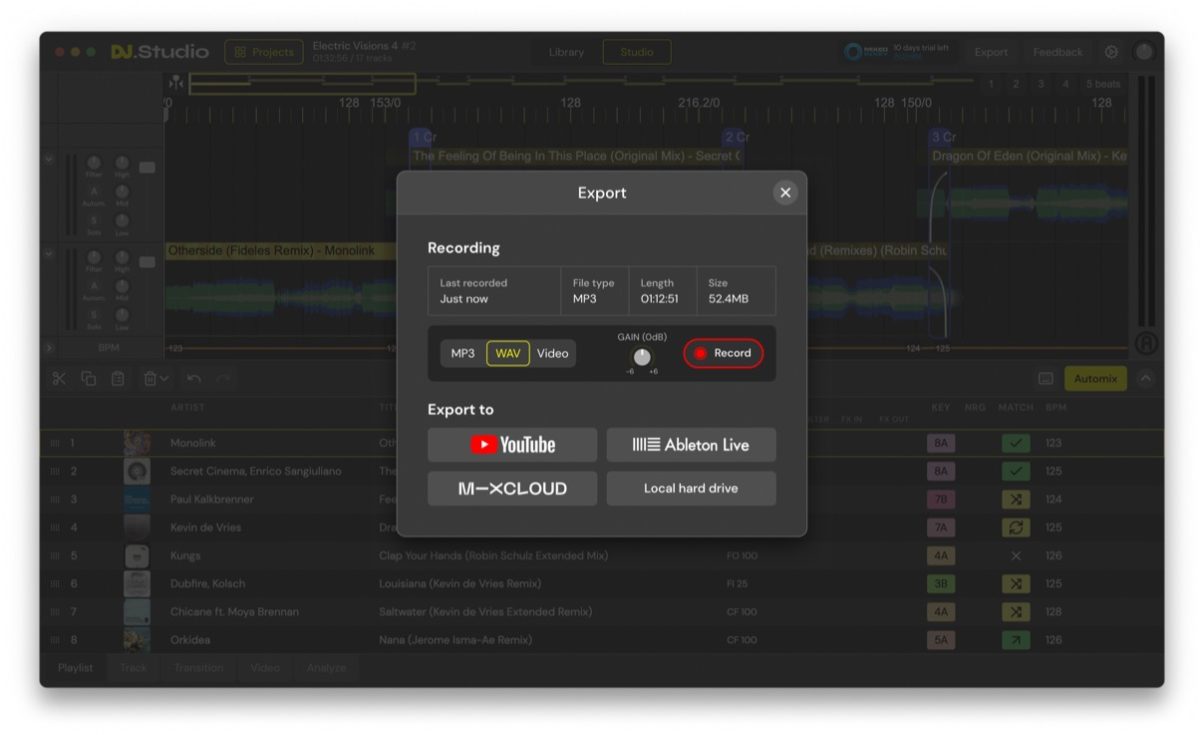 When it comes to exporting your mix, DJ.Studio “renders” the output, like a video editing app might, or like Ableton would with a project, to turn it into a finished MP3 or WAV. It can then upload this to Mixcloud additionally if you like, complete with timestamps, titles and artists. But it has two more aces up its sleeve: