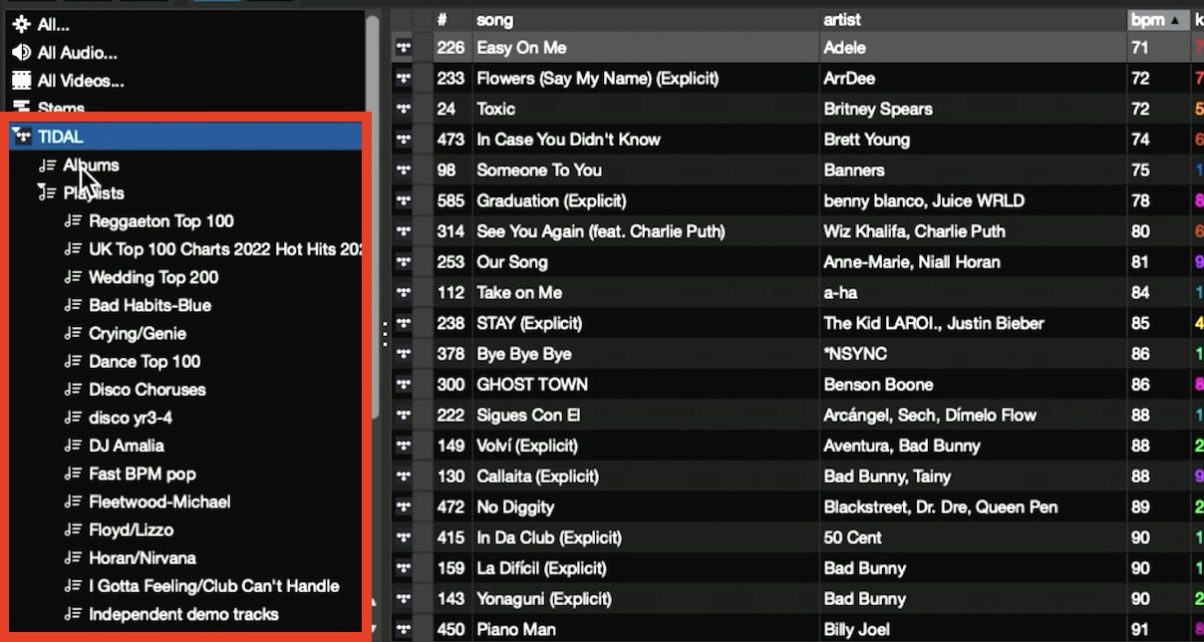 Once you have, all their playlists, charts, genres etc are there, with search, and all your playlists too. Note that it’s usually best to build your playlists away from your DJ software, though sometimes it is possible to do this in the DJ software, too.