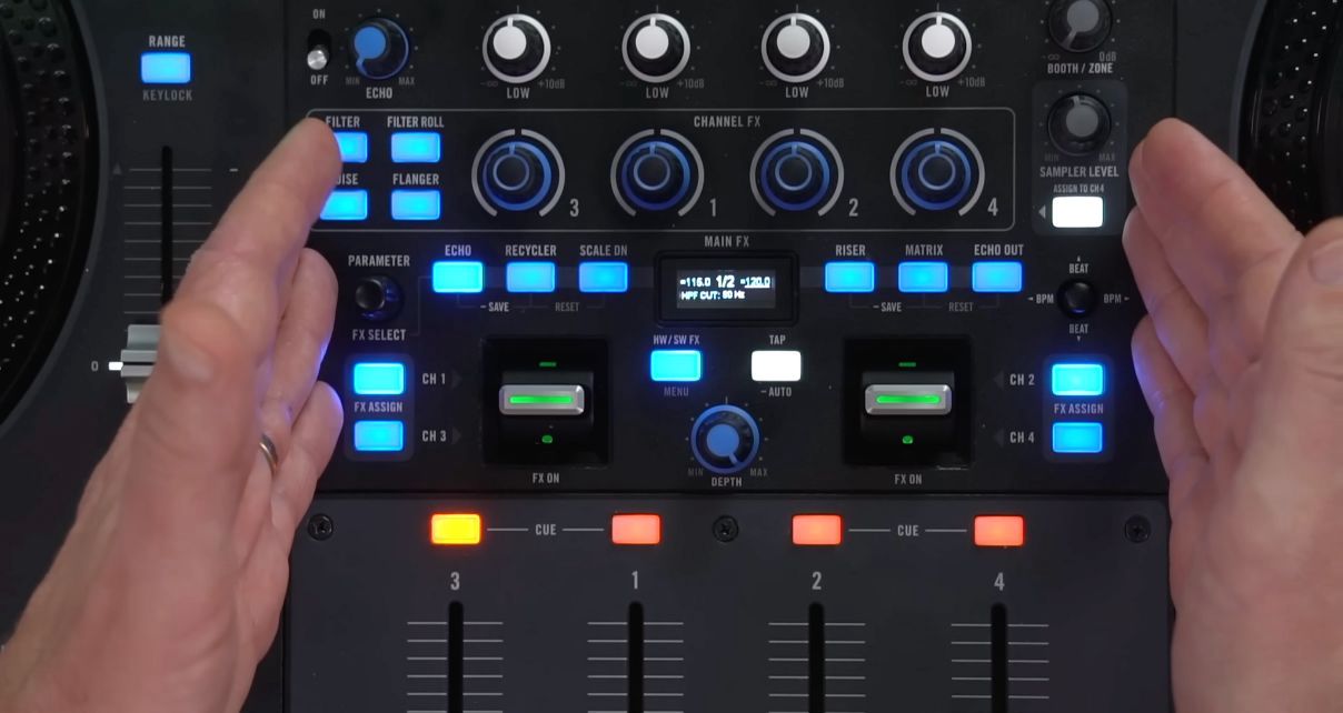 The Rane Four has 22 main hardware effects, whereas the DDJ-FLX10 has 14 such effects. The layout and accessibility of these effects follows the “club mixer style” on the DDJ-FLX10, but the “scratch mixer style” (ie with paddles) on the Rane Four. You’ll prefer one or the other.