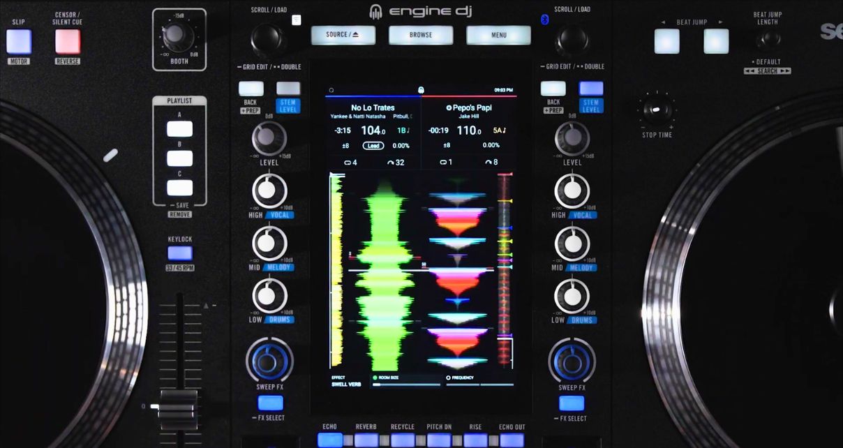 When connected to a computer running Serato DJ Pro, a Serato source icon appears on the System One’s touchscreen alongside your other sources – USB, SD card, internal drive, and streaming services. Switching between them is fast and intuitive, and the System One’s touchscreen gives you full Serato library navigation: browsing crates, sorting by BPM and key, swiping to load tracks, zooming waveforms, and adjusting key sync.