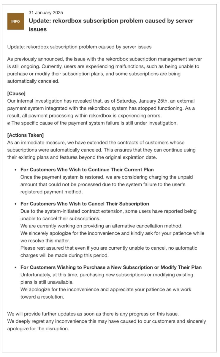 On 31 January, AlphaTheta acknowledged the server issues affecting Rekordbox subscription services in an official statement, and reassured users they are working on a solution. However, no timeline for fixing the problem has been provided.