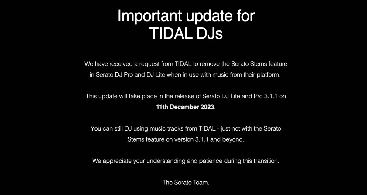 In a development that will not surprise anyone, Serato has announced that support for using its stems functions when streaming music from Tidal is being phased out.